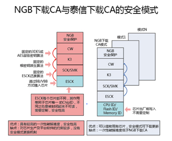 上圖中,終端芯片中的Chip ID、ESK根密鑰都是與硬件關(guān)聯(lián)的標(biāo)示,二者都是與硬件關(guān)聯(lián),且不可更改,具有等同的作用。所不同的是ChipID沒有包裹黑盒,是可見的,以此為安全基礎(chǔ)芯片不需要定制;ESK按照NGB下載CA的要求是不可見的,以此為安全基礎(chǔ)芯片需要定制。