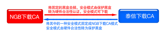 二者的主要區(qū)別在于泰信下載CA不需要黑盒保護(hù),NGB下載CA需要黑盒保護(hù)。二者之間的轉(zhuǎn)換關(guān)系如下: