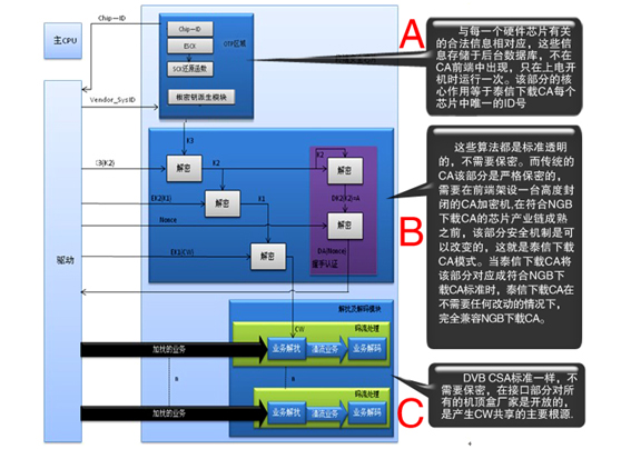 NGB下載CA的密鑰及派生算法均與加密機(jī)及前端CA服務(wù)器分離,即使有黑盒的NGB下載CA,黑盒保護(hù)的是與機(jī)頂盒有關(guān)的根密鑰,這個(gè)根密鑰與每一臺(tái)合法的芯片邦定,其作用與每一臺(tái)終端唯一的ID號(hào)等同,也與互聯(lián)網(wǎng)安全保護(hù)的CA證書作用類似,而用于CW加密的算法是標(biāo)準(zhǔn)和開放的,這個(gè)算法在終端中的使用頻次很低。因此,不論NGB下載CA還是泰信下載 CA,都不需要再像以往的CA那樣在前端機(jī)房設(shè)置一個(gè)高度封閉的用于加密CW的加密機(jī),可以不需要在運(yùn)營(yíng)商前端下載CA服務(wù)器設(shè)置黑盒。