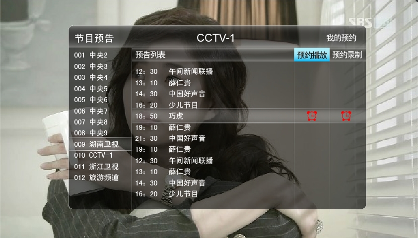 點(diǎn)擊遙控器上的“節(jié)目表”,然后會(huì)出現(xiàn)節(jié)目預(yù)告EPG信息,可選擇自己喜歡的節(jié)目進(jìn)行預(yù)約播放或者預(yù)約錄制。若進(jìn)行了預(yù)約播放,不論您處在哪個(gè)電視頻道,到達(dá)時(shí)間點(diǎn)都會(huì)提示您,是否播放,以免錯(cuò)過喜愛的節(jié)目。預(yù)約錄制可以將喜歡的節(jié)目錄制下來,有時(shí)間再回看。此設(shè)計(jì)非常人性化,且很方便。