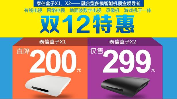 雙“12”的號角已經(jīng)吹響,再不出手就來不及了。泰信盒子值雙十二來臨之際,從功能和配置上較其它網(wǎng)絡(luò)盒子相比,以有史以來最低的價格回饋廣大用戶。12月8日泰信盒子系列產(chǎn)品已經(jīng)在官方淘寶店和官網(wǎng)商城全面現(xiàn)貨開售,并已將價格提前調(diào)制雙十二最低價,各種配件更是超低價,讓用戶提前感受雙十二的氛圍,避免購買繁忙時網(wǎng)頁卡頓和快遞爆倉的情況。