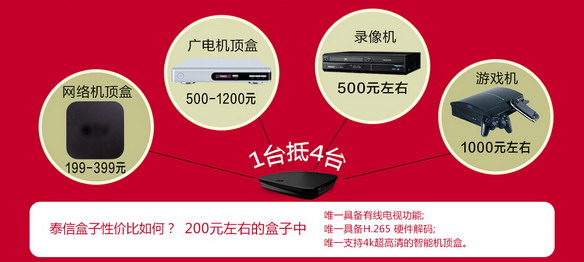 現在,有一款融合有線電視和網絡電視的機頂盒—泰信盒子,讓您由被動的看電視到主動的玩電視,變身電視的主人。泰信電子擁有二十年數字電視技術研發經驗,借助自主研發的直播電視操作系統DTVOS,實現了有線電視、網絡電視、錄像機、游戲機等功能的融合,全國通用,開啟了第四代機頂盒的新時代,彌補了廣電有線電視機頂盒和網絡機頂盒無法兼容的缺陷,讓您不必因看不同內容而頻繁切換盒子。其家庭共享功能可以讓您只交一份錢,多臺電視機免費看有線電視,絕對是省錢好幫手。