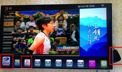 首先,接通電源開機,界面別具一格。設置網絡完畢后直接進入到主界面,有線電視和網絡電視應用圖標一目了然,顯要位置主要是有線電視預覽畫面。界面左上角及下方快捷應用中有華數TV的標志。廣電有線電視和互聯網電視牌照方正版視頻內容的雙授權,增加了泰信盒子制勝網絡盒子的砝碼。