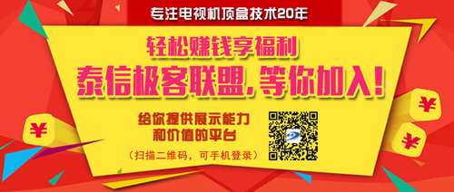 因為使用早期的泰信盒子需要一定的專業知識,這些老客戶可以稱之為電視界的極客。為了感謝這些老客戶,泰信將與這些極客成為“極客盟友”,幫助泰信讓更多的人使用泰信盒子,不用開店就可輕松與泰信分享成功的紅利參與活動規則請登錄手機版官網(http://www.huatianxing.com.cn)查看《泰信極客聯盟盟友須知》。