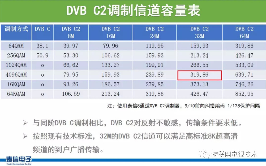 將DVB C機頂盒升級為DVB C2,實現量產后成本增加可以忽略。即使有線電視現有網絡環境只能采用DVB C 64QAM調制方式,升級同樣傳輸條件的DVB C2 256QAM之后,可以馬上開通53Mbps高碼流標準的超高清頻道,今后可升級到80Mbps的4096QAM。