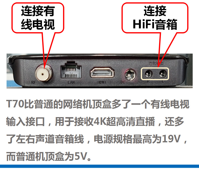 T70除多了兩個(gè)音箱線接口,其它的使用和普通機(jī)頂盒的使用方法相同。