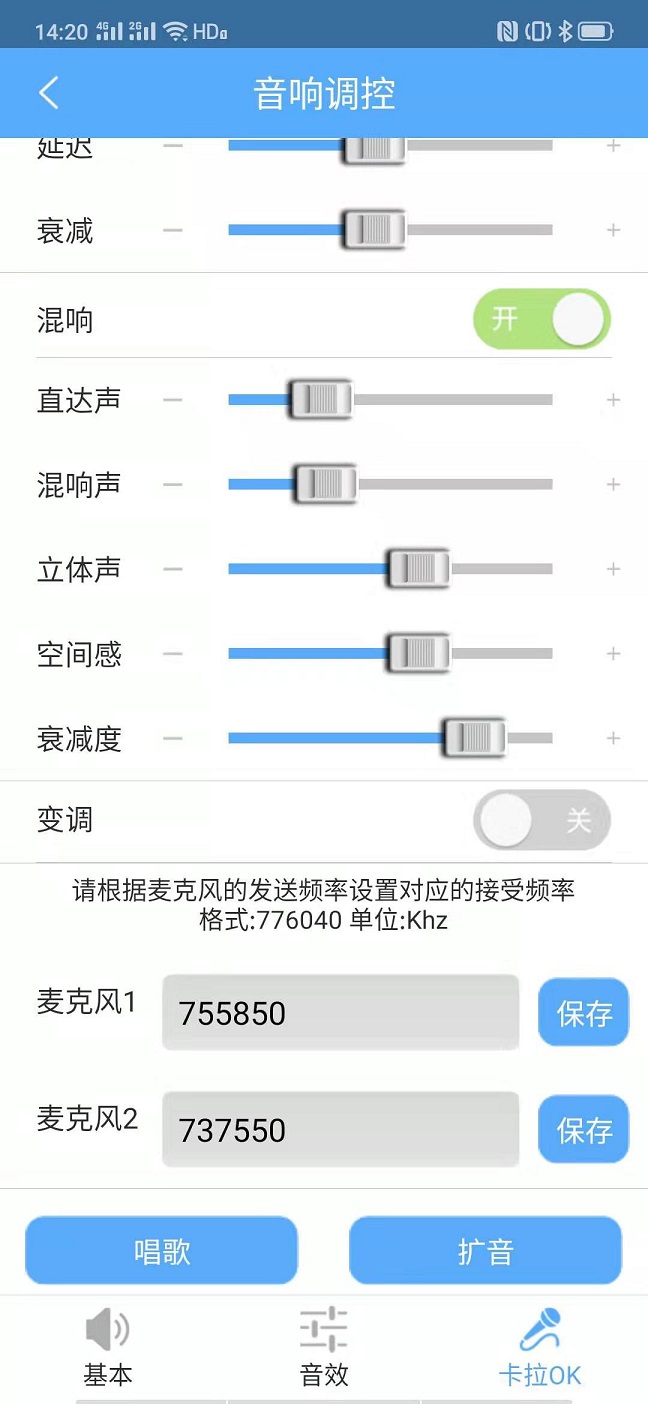 T6K內(nèi)置了數(shù)字U波段麥克風(fēng)接收器,可以在手機(jī)上設(shè)置接收頻率。方法是進(jìn)入“我的\音響調(diào)控\卡拉OK\控制頁(yè)面下拉菜單,就可以看到兩個(gè)麥克風(fēng)接收頻率設(shè)置選項(xiàng),只要其中一個(gè)頻率與你的麥克風(fēng)頻率相同,就可以接受到麥克風(fēng)聲音。