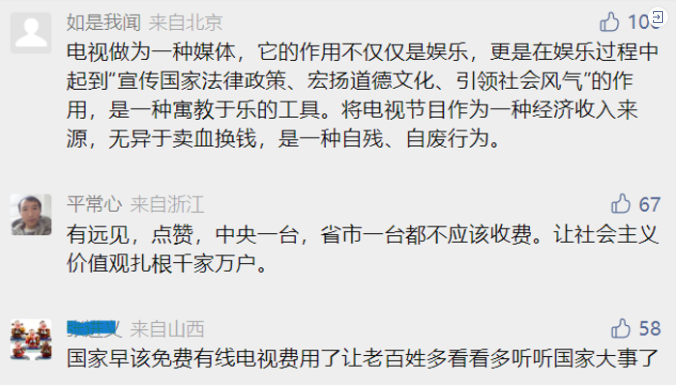 在《政府采購,老百姓看電視免費,重啟有線電視公共服務屬性!》一文中的網友留言中你會看到,人們對這一觀點有強烈的認同感