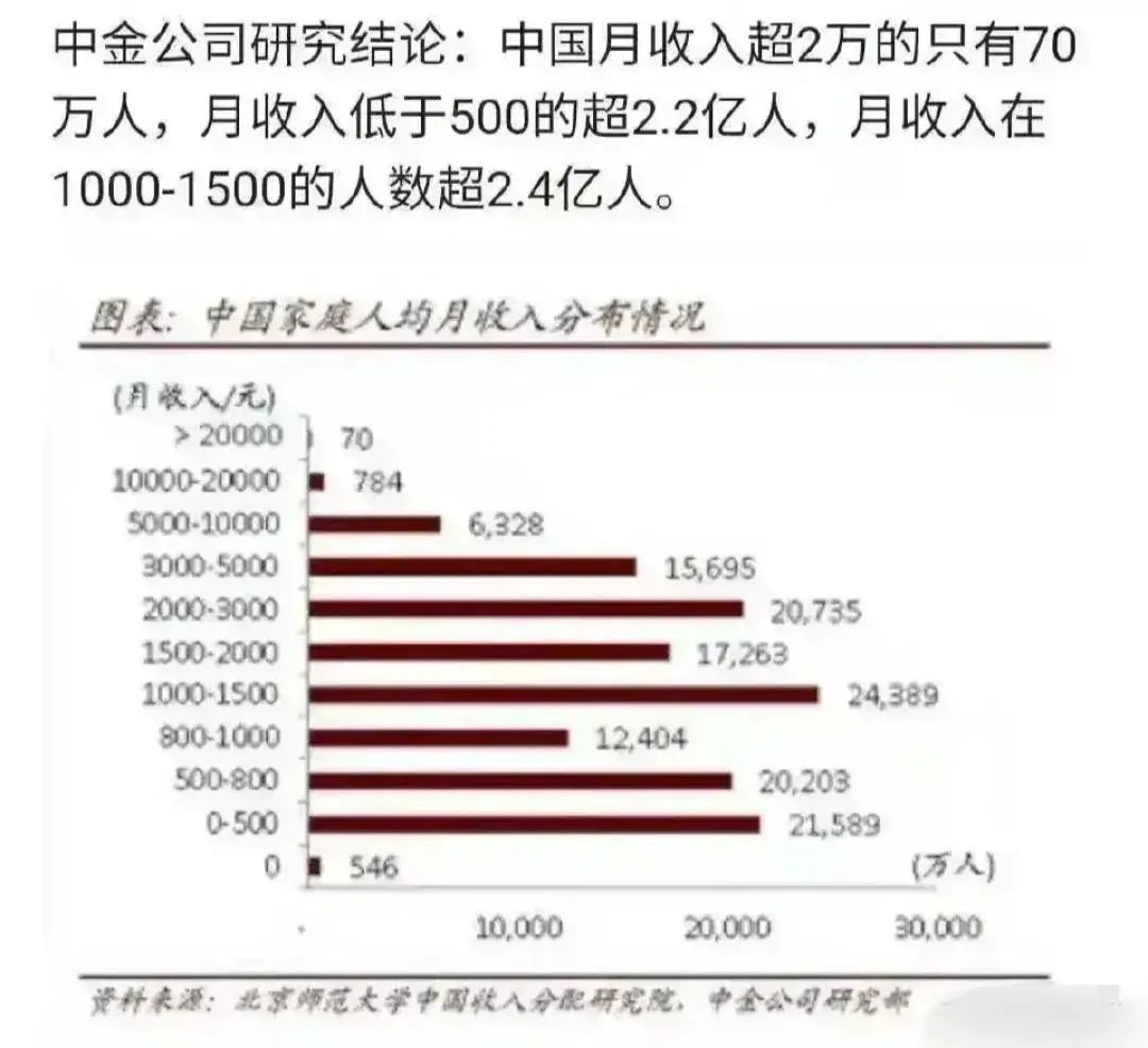 平均月收入在1000-5000元的中等收入人群,數量也有大約8億。而高于5000元的人群,僅有0.72億。
