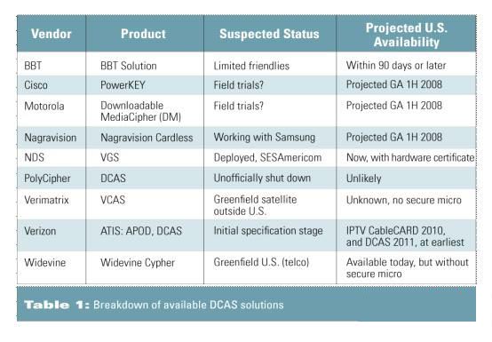 在10年前,每個(gè)芯片在生產(chǎn)過程中設(shè)置一個(gè)唯一的ID號(hào)是一個(gè)難以做到的事情,而且非常昂貴,機(jī)頂盒作為一個(gè)軟硬件高度集成的設(shè)備不具備DCAS的運(yùn)行環(huán)境。換句話說,DCAS的實(shí)現(xiàn)需要一個(gè)類似現(xiàn)在智能終端的綜合產(chǎn)業(yè)環(huán)境,但DCAS生不逢時(shí),這就注定了美國當(dāng)時(shí)DCAS在很大程度上處于探討階段。從Bruce Bahlmann的文章中一個(gè)表格可以看出,有眾多聲稱能夠提供DCAS的公司,但基于傳統(tǒng)的軟硬件捆綁的嵌入式系統(tǒng),實(shí)際進(jìn)展非常緩慢。