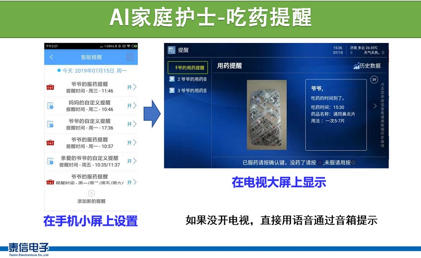 T70可以在老人看電視的時候提醒按時吃藥,即使關掉電視,使用外置音箱也會通過語音提醒老人。