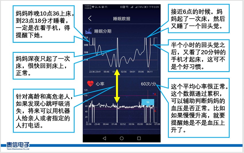 在電視大屏和手機小屏上都可以展示睡眠健康信息,方便老人和子女觀察。 這是一個上班族對媽媽夜晚睡眠數據報告的解讀。借助人工智能,使用傳感器的時間越長,分析的結果就越準確。