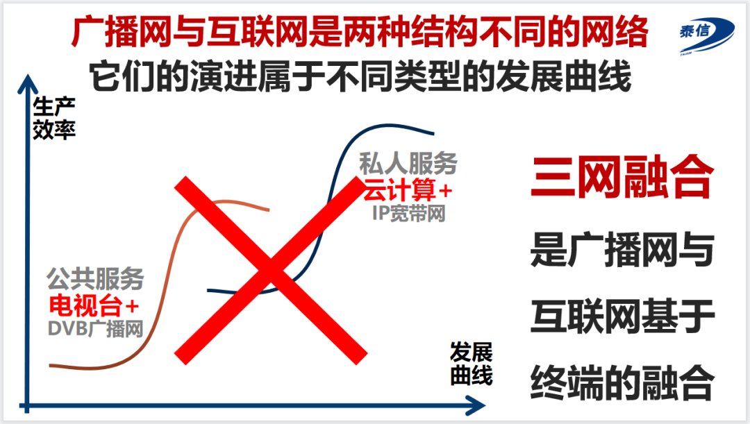 廣播網(wǎng)是以電視臺為中心的點對面的公共服務(wù),互聯(lián)網(wǎng)則是以各種云計算為中心的點對點的私人服務(wù),二者有各自的應(yīng)用場景,在社會功能上各有不同,是兩種結(jié)構(gòu)不同、有各自的優(yōu)缺點、不能互相代替的網(wǎng)絡(luò),不存在相互迭代關(guān)系,只能基于終端融合發(fā)展。
