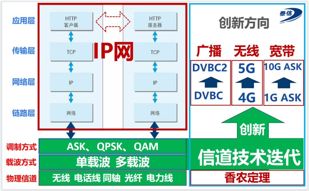 該圖中標(biāo)識了IP協(xié)議在網(wǎng)絡(luò)中的位置,它位于基礎(chǔ)信道技術(shù)之上,是屏蔽了信道差異性、與信道無關(guān)的互聯(lián)網(wǎng)通信協(xié)議。綠色部分是網(wǎng)絡(luò)技術(shù)的創(chuàng)新方向。3-5G、WiFi、光纖通信等技術(shù),都是在這個方向上進行創(chuàng)新,目的是盡量高效地利用物理信道。